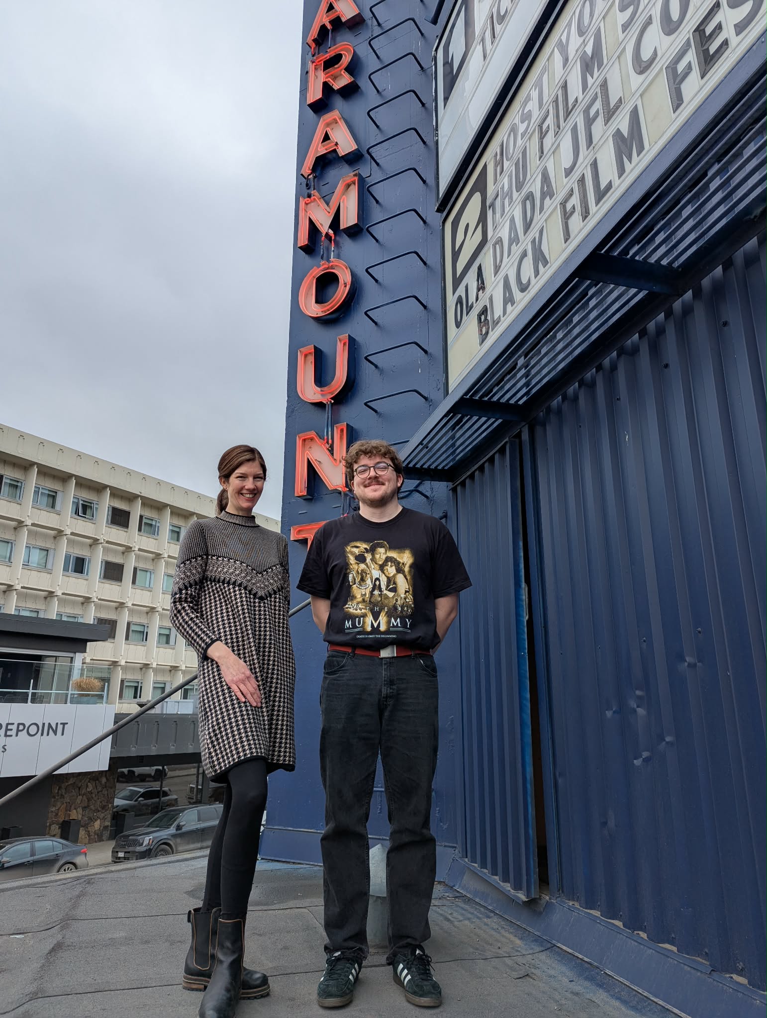Kamloops Film Festival Programmer Sam Theriault and Kamloops Film Society Executive Director Colette Abbott stand under the Paramount sign. Photo by Juli Harland